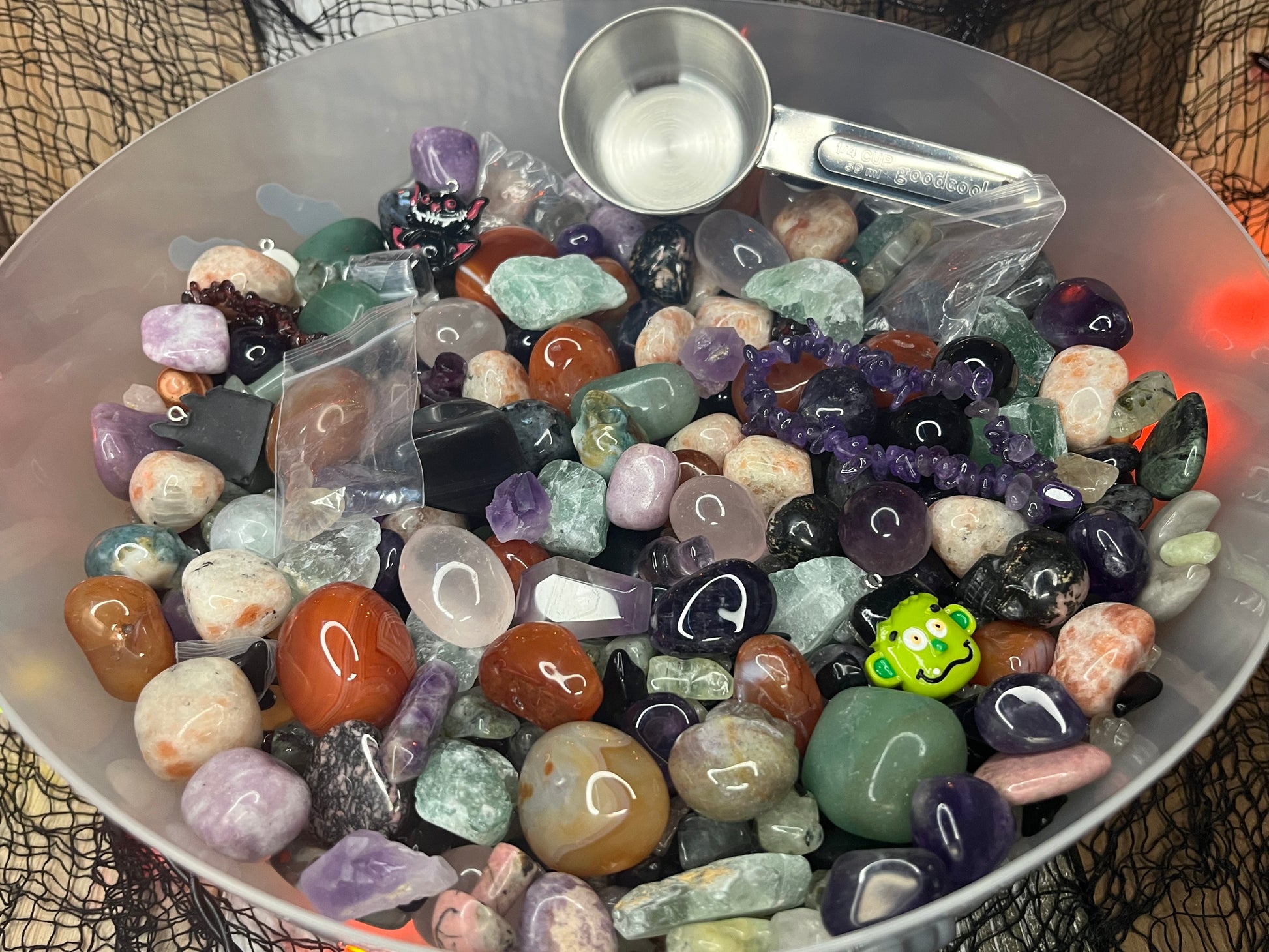 • Halloween Carvings: Black Obsidian Coffins, Amethyst Coffins, Moss Agate Skulls, Rhodonite Skulls, Mini Fluorite Pumpkin Heads, Mini Fluorite Witches Brooms, Mini Fluorite Wizard hat, Halloween resin charms